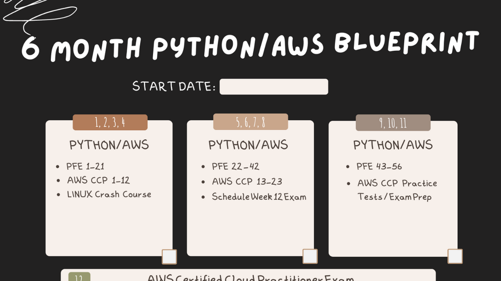 So I decided to create a blueprint cheat sheet of how exactly a person would learn to code with Python while pursuing two AWS certifications at the same time with the ultimate goal of landing a job in the software industry.